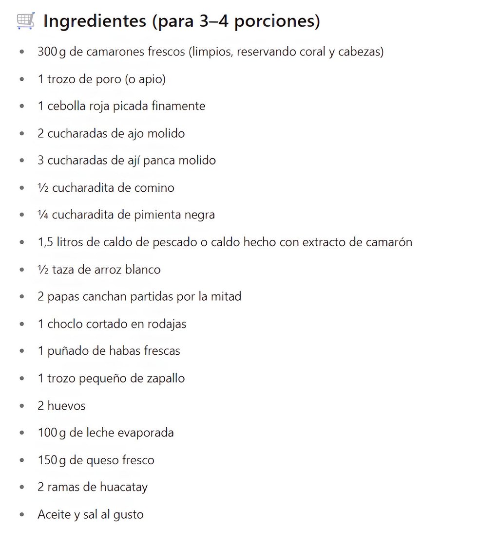 Aunque el chupe de camarones es emblemático, existen variantes que emplean pescado, habas, olluco o ingredientes verdes, adaptándose a los productos regionales disponibles según la estación y la localidad.